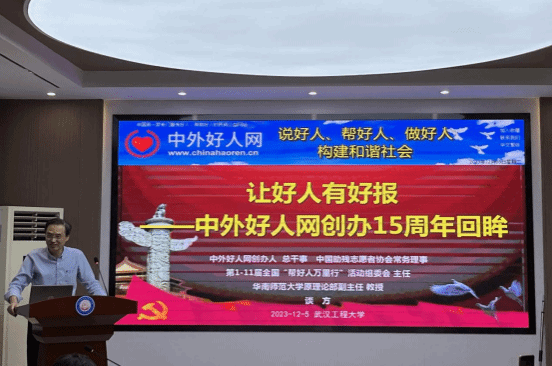 (通讯员:熊雪璟 张悦)12月5日晚,中外好人网武汉办事处授牌聘任仪式暨大型思政选修课《加油中国》第五季第七讲在mk体育官网求是楼112报告厅举行。“中外好人网”创办人、华南师范大学谈方教授受邀主讲,以“让好人有好报—中外好人网创办15周年回眸”为主题,从什么是“中外好人网”、为什么要创办中外好人网以及中外好人网15年的发展历程和成绩三个方面为大家做了详细阐释,本次活动由mk体育官网,mk体育官网副院长常城教授主持。