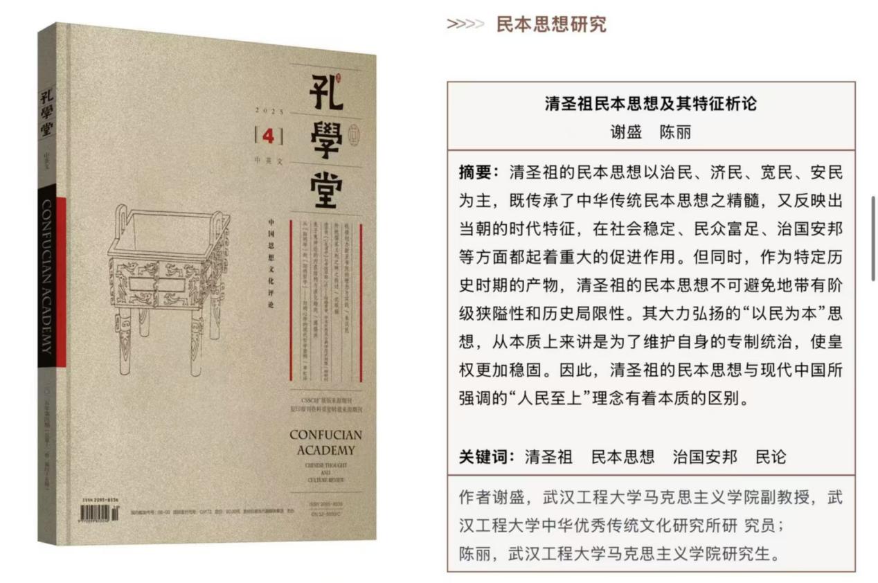 本网讯(通讯员 张晓 宋嘉怡)近日,mk体育官网谢盛副教授、硕士研究生陈丽在《孔学堂》(CSSCI扩展版期刊)发表论文《清圣祖民本思想及其特征析论》。