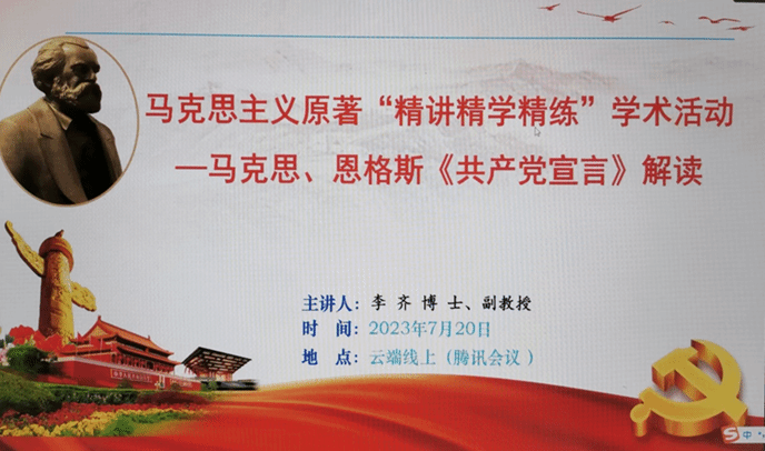(通讯员:沈洁)7月20日,mk体育官网2023年暑期马克思主义原著“精讲精学精练”学术活动第一讲在腾讯会议顺利举行,本次活动由李齐副教授主讲,学院全体研究生参加了本次学术活动。此次活动的主题为“马克思、恩格斯《共产党宣言》解读”。