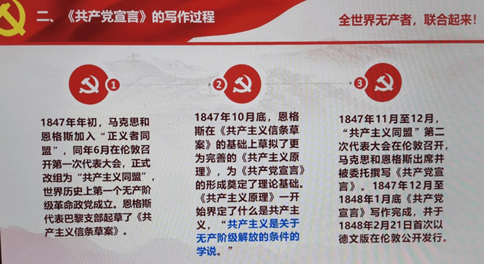 李齐老师首先讲解了《共产党宣言》对新时代中国特色社会主义发展的重大意义,随后在思想史的脉络中为同学们详细介绍了《共产党宣言》的写作过程,在叙述各个章节的内容、特点等同时,也帮助大家厘清了《共产党宣言》的基本框架。