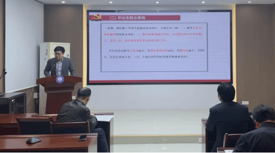 学院研究生工作办公室主任蔡明广首先汇报了学院毕业生的基本信息及就业去向。2024届的87名应届毕业生的就业意向主要分为三类:一是报考公务员或事业单位;二是进入教育或科研领域,包括思政课教师和辅导员职位;三是参与企业党务及理论宣传工作。蔡明广还详细分析了当前高校的就业形势和目前毕业生的就业情况,并从就业工作的目标、策略、加强就业教育和队伍建设等方面进行了详细汇报。
