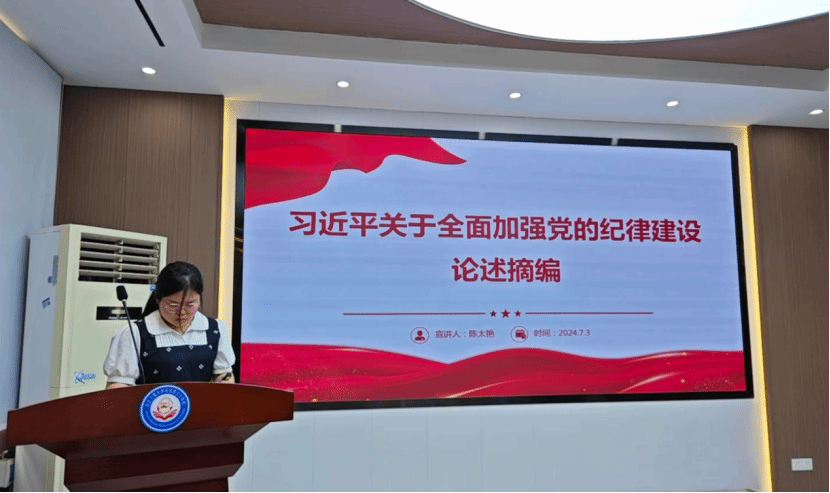陈太艳同志带领全体党员学习《习近平关于全面加强党的纪律建设论述摘编》。她介绍到《摘编》分10个专题,共计329段论述,全体党员同志应结合学习《摘编》,认真领会习近平总书记有关重要论述,真正做到学纪、知纪、明纪、守纪,切实把纪律规矩转化为政治自觉、思想自觉、行动自觉。