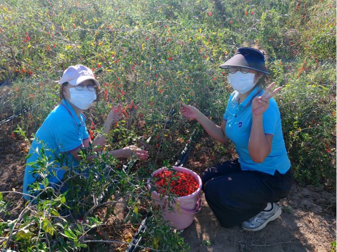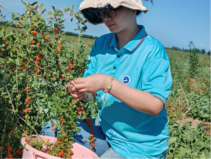 访谈结束后,实践队迅速行动起来,要真正了解杞农们的困境与需求,就必须亲身体验枸杞的生长环境与采摘过程。队员们纷纷穿戴好防晒装备,满怀热情地与杞农们一同投入到紧张的枸杞采摘工作中。在烈日炎炎下,实践队员们挥汗如雨,她们穿梭在茂密的枸杞林间,小心翼翼地采摘着每一颗成熟的枸杞。汗水浸湿了衣衫,但她们的脸上却洋溢着帮助他人、收获成果的喜悦。这次亲身体验,让队员们深刻感受到了农业劳动的艰辛与不易,也让她们对杞农们的付出与坚持充满了敬意。通过与杞农们的并肩作战,实践队员们更加直观地了解了枸杞的生长环境与采摘过程,亲身体验了采摘枸杞的繁琐与劳累。这些经历让实践队员们更加深刻地认识到了枸杞产业的重要性以及杞农们所面临的困境和挑战。