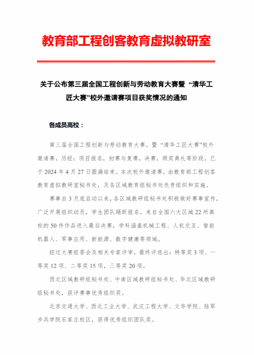 (通讯员:李盈萱 张雅婷)2024年4月27日,由教育部工程创客教育虚拟教研室秘书处,及各区域教育组秘书处负责组织和实施的全国工程创新与劳动教育大赛暨第三届“清华工匠大赛”校外邀请赛圆满落幕。历经:项目报名,初赛与复赛,决赛,颁奖典礼等阶段,经过激烈角逐,mk体育官网三支参赛队伍荣获全国三等奖的成绩,展现了mk体育官网在工程创新及劳动教育方面的卓越成果。