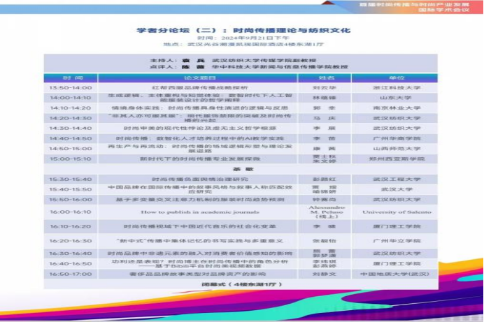 会议以"创新.融通:数字科技、时尚传播和时尚产业发展"为主题,由中国新闻史学会与武汉纺织大学联合主办,厦门理工学院影视与传播学院协办,武汉纺织大学传媒学院承办。会议邀请了学界业界的专家学者对时尚传播的体系建构、理论阐释、实践路径等方面展开建设性的探讨。