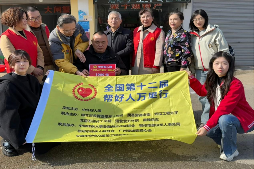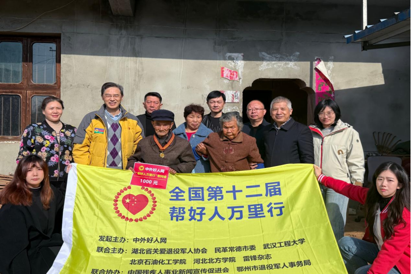 (通讯员 王芸歌 严沁晗)11月25日至26日,由中外好人网发起主办、我校等单位联合主办的全国第十二届“帮好人万里行”湖北之行大型公益活动在鄂州拉开帷幕。参加此次活动的代表团成员包括湖北省关爱退役军人协会副秘书长石江林,全国第一至第十二届“帮好人万里行”组委会主任、中国好人网创办人谈方教授,中外好人网鄂州办事处主任苏柳英,鄂州市退役军人事务局党组成员、副局长江曹阳,鄂州市关爱退役军人协会副会长黄朝耀,鄂州市退役军人服务中心主任戴柏秋,我校mk体育官网杨晴副教授、杨铭博士以及2名硕士研究生代表。活动为期两天,代表团成员在鄂州深入多个村庄、社区,对抗美援朝作战老兵、优秀困难老兵、优秀困难残疾人等10 人进行了慰问,颁发慰问金 2.1 万元。
