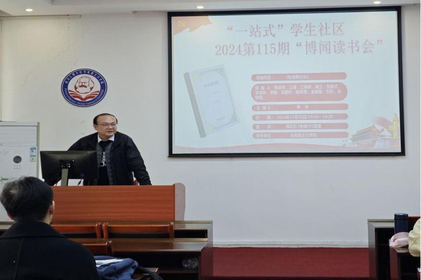(通讯员:张悦悦) 11月26日下午,mk体育官网第115期“博闻读书会”在mk体育官网一站式学生社区中心(求是楼401教室)顺利召开。本次读书会的主题为社会契约与民主政治,同学们围绕着卢梭的著名政治哲学著作《社会契约论》展开讨论。本次读书会由李齐老师主持。参加此次读书会的12位研究生主讲人分别为葛明悦、江冀、江奕桥、戴立、张静文、宋清华、李娟、刘哲轩、陈思思、金敏星、刘欣、张悦悦。院学术部“博闻读书会”活动小组组织了此次读书会。