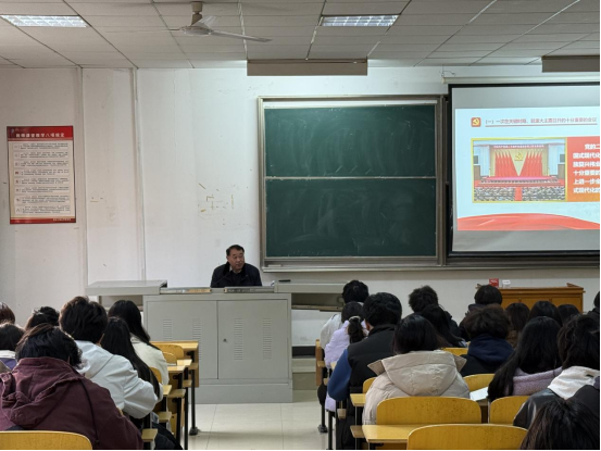 就此专题,李书记重点从三个方面对党的二十届三中全会精神进行了讲解:一是深刻把握党的二十届三中全会的重大意义。此次会议对通过进一步全面深化改革推进中国式现代化作了系统部署,是充分发扬民主、广泛凝聚智慧的高质量会议,受到社会高度关注和国际高度评价。二是深刻把握习近平总书记在党的二十届三中全会上的重要讲话精神。新时代以来的重大成就为推进中国式现代化赢得了战略主动,此次全会紧扣了新时代新征程党的中心任务,明确了进一步全面深化改革的重要性和必要性,深化了对改革的规律性认识,确保了全面深化改革沿着正确方向前进。三是深刻把握党的二十届三中全会《决定》提出的进一步全面深化改革重大举措。牢牢牵住深化经济体制改革这个“牛鼻子”,健全完善全过程人民民主制度体系和中国特色社会主义法治体系,深化文化体制机制改革,健全保障和改善民生制度体系,深化生态文明体制改革,推进国家安全和社会治理体制机制改革,持续深化国防和军队改革,以及党的建设制度改革等。最后,李书记鼓励青年学生努力争做有理想、敢担当、能吃苦、肯奋斗的新时代好青年,在推进强国建设、民族复兴伟业中展现青春作为、彰显青春风采、贡献青春力量,奋力书写中国式现代化挺膺担当的青春篇章。