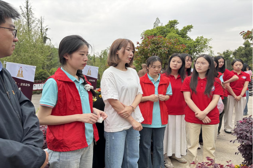 在烈士陵园的露天课堂中,崔晋文老师为师生带来沉浸式思政课。她结合陵园内长眠的1300余位烈士事迹,剖析革命精神与新时代的链接:“从‘救国’到‘强国’,精神内核一脉相承。今天的青年要做的,是将个体奋斗嵌入民族复兴的坐标系。”团委书记汪喆伦则从“知行合一”角度,号召学生将爱国情怀转化为创新实践:“先烈用生命诠释信仰,我们要用行动续写答卷。”
