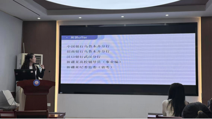 随后,范鑫聚焦省考、事业编和银行招聘,从选岗原则、笔试备考到面试技巧进行了全面讲解。她建议同学们优先选择“应届岗”和“限专业岗位”,并分享了行测五大板块的高效学习方法。针对银行招聘,她提醒同学们注重行测和行史知识的积累,并强调本地报考的优势。最后,她以“追风赶月莫停留,平芜尽处是春山”寄语在场同学,传递了积极向上的备考心态。