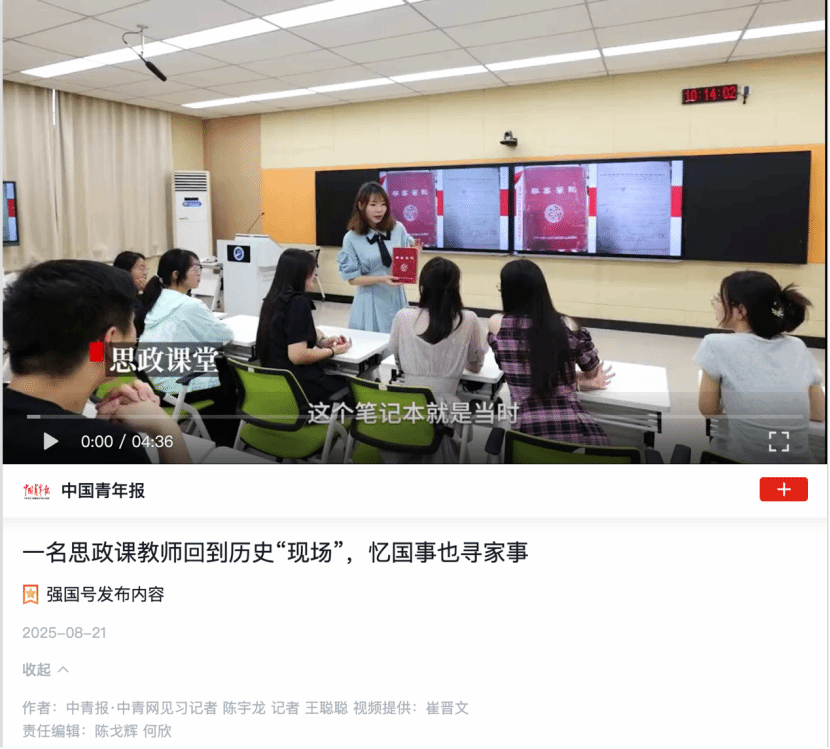 那枚功章再次被包裹起来,等待下一次课的开启。但它点亮的光芒早已穿透课本,照进了许多年轻人的心里。它不是结束,而是无数个旅程的开始。“历史不是一本结论明确的‘答案之书’,但它能为学生提供思考的角度。”崔晋文表示,她将继续整理新素材、新感悟,让“行走的思政课”不断延伸,帮助更多学生在与祖辈、历史的对话中,明确成长方向、树立人生目标,培育健全人格,让红色基因在青春的血脉中代代相传。