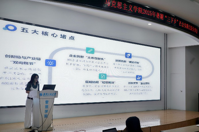 分享会第一阶段以“实践成果交流”为核心,五支暑期“三下乡”实践团代表依次上台发言,用鲜活案例与生动细节,展现马院学子在实践中的担当与成长。