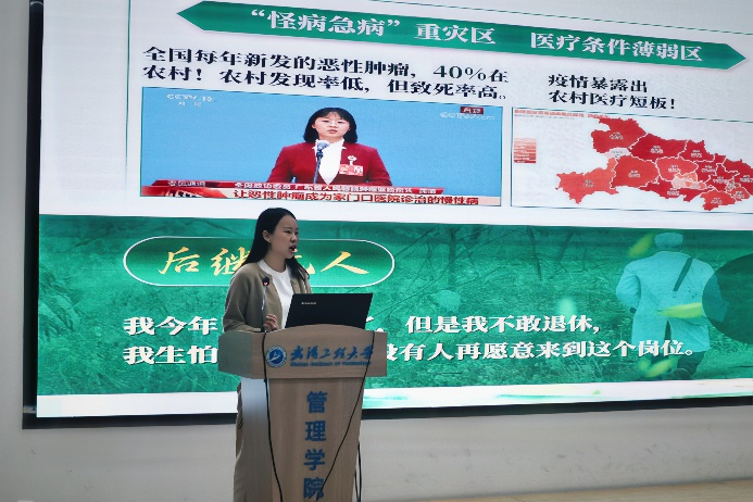 “医路同行”实践队代表徐嘉婧围绕基层医疗与AI赋能展开汇报,分享团队深入触摸基层医疗脉搏的实践经历,以及探寻AI赋能医疗路径的探索成果,彰显青年学子的专业实践与创新思考。
