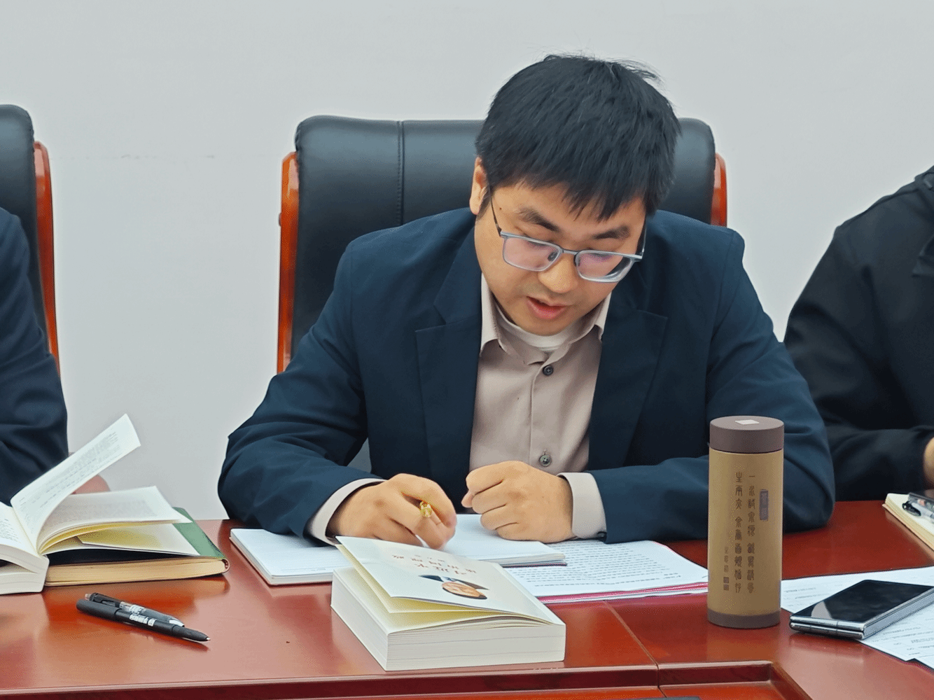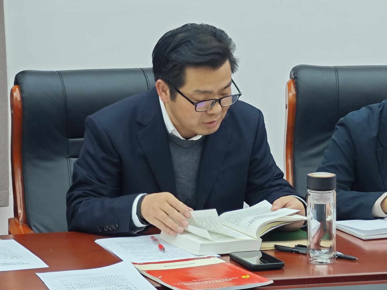 会上学院党委委员、院长曹胜亮同志领学了《习近平谈治国理政》第五卷专题一:以中国式现代化全面推进中华民族伟大复兴。他在学习中指出,要深刻领会中国式现代化的丰富内涵,就要正确理解和把握中国式现代化的发展历程、本质要求及战略安排,强调要站在历史发展和民族伟大复兴的高度,在理论学习中勤修勤练,在实践磨砺中笃信笃行。