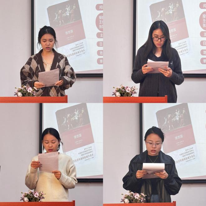 吴晓悦同学聚焦《理想国》第七卷 “洞穴寓言”,解析其象征结构与思想内核,指出教育本质是灵魂转向而非知识灌输。她结合当代教育与管理现实,反思数字化时代的新 “洞穴” 困境,强调教育需引导人突破认知局限、追寻真理。李素奕同学聚焦《理想国》第七卷 “洞穴喻”,解析其认识论、教育转化及教育者使命三层内涵,强调教育本质是灵魂转向而非知识灌输,结合当代教育管理反思其现实启示与历史局限性。徐嘉婧同学聚焦《理想国》第五卷,解析男女平等、妇女儿童公有、哲学家治国 “三重浪涛” 核心主张,肯定其超越时代的理念,也指出其工具性、反人性等局限,结合现实探讨人才选拔、公私利益平衡等启示。张思雨同学以马克思主义视角解读《理想国》,梳理其理想城邦构建逻辑,聚焦 “洞穴比喻” 解析内涵,肯定其认知启示,批判其唯心与精英主义局限,辨析其与马克思主义理想的本质差异。