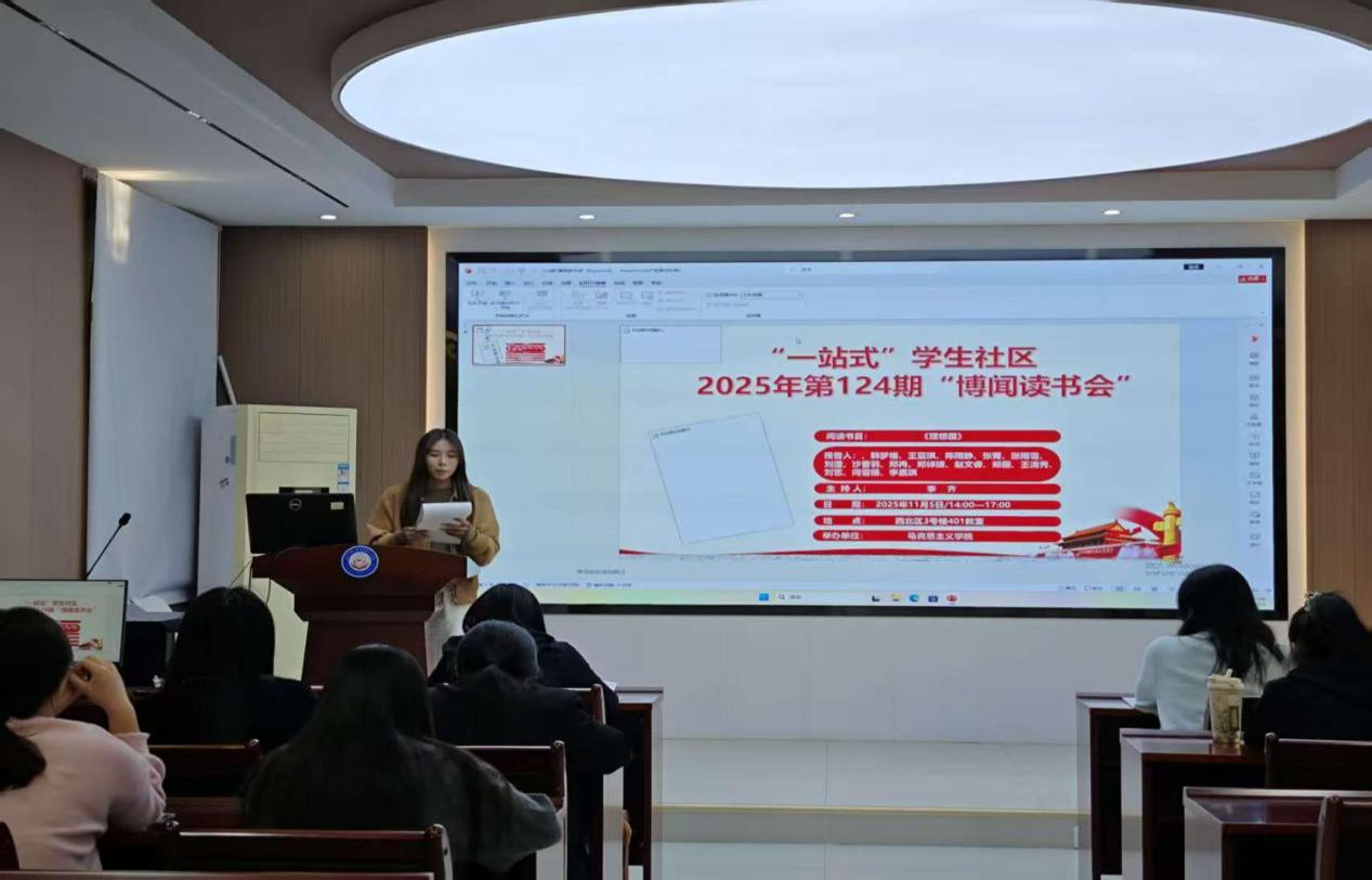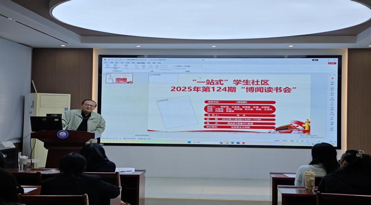 本网讯(通讯员:张潇、杨秀)11月5号下午,mk体育官网“一站式”社区第124期“博闻读书会”在mk体育官网求是楼112报告厅顺利召开。本次读书会以《理想国》的理想为主题,围绕着柏拉图的著作《理想国》展开讨论。本次读书会由李齐老师主持。参加此次读书会的2025级15位研究生主讲人为韩梦格、王亚琪、陈雨静、张菁、张雨雪、刘滢、沙香羽、郑冉、郑倬捷、赵文睿、郑薇、王清秀、刘艺、闫雪晴、李嘉琪。院“博闻读书会”学术活动工作小组组织了此次读书会。