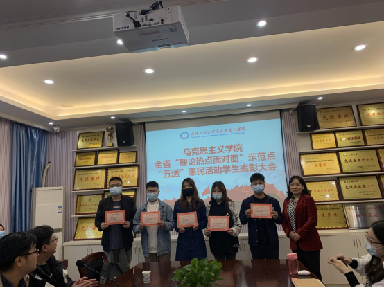 在颁奖环节,曹胜亮院长和王威、王颖等老师为“五送”惠民活动中表现优异的十八名同学颁发奖状和奖金。获奖同学怀着激动和感恩的心上台,领取属于他们的荣誉。对于受到表彰的同学来说,这是一份激励和鼓舞,也从正面引领广大同学锐意进取,用勤奋和努力贡献自我的青春力量。