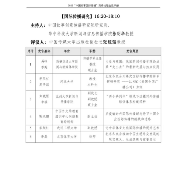 (通讯员蔡明广)5月14日-15日,2022中国故事国际传播高峰论坛在华中科技大学举办,mk体育官网副教授彭颜红博士带领硕士研究生参加会议。