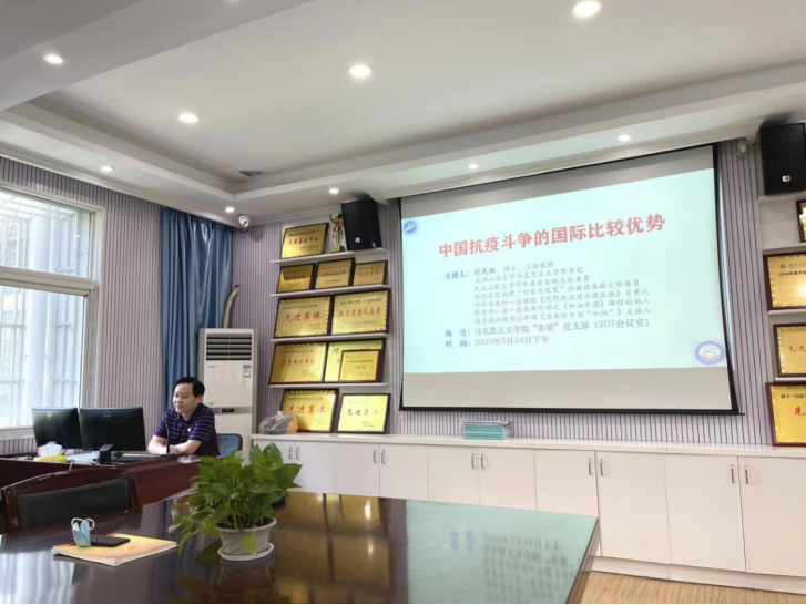 (通讯员陈永贵)5月24日下午,“形策”党支部主题党日活动在mk体育官网二楼会议室举行。院党委书记舒先林作为特邀代表出席活动并讲授《中国抗疫斗争的国际比较优势》微党课,院党委副书记、副院长(兼)陈俊作为学院联系“形策”党支部领导参加活动。本次活动由“形策”党支部书记陈永贵主持。
