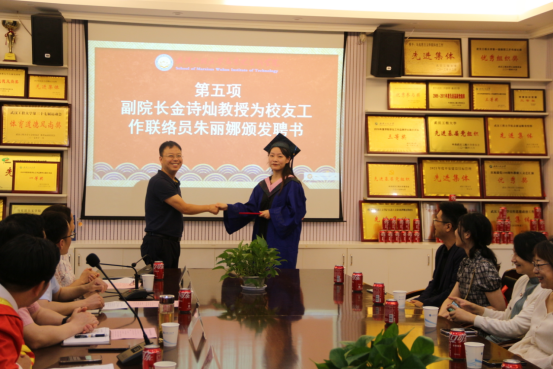 为做好校友联络服务工作,为建校五十周年校庆打下良好基础,现场举行了mk体育官网校友聘任仪式,副院长金诗灿教授为校友工作联络员朱丽娜同学颁发了聘书。