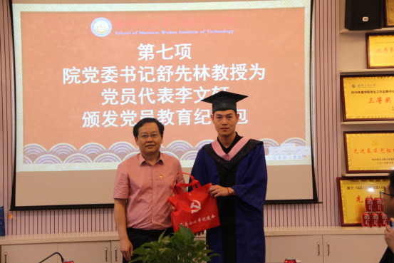 为进一步引导毕业生党员们走出校门后“不忘初心、牢记使命”,进一步增强“四个意识”,坚定“四个自信”,捍卫“两个确立”,做到“两个维护”,始终发挥共产党员先锋模范作用,院党委书记舒先林教授现场为毕业生党员代表李文轩同志颁发了党性教育纪念包。