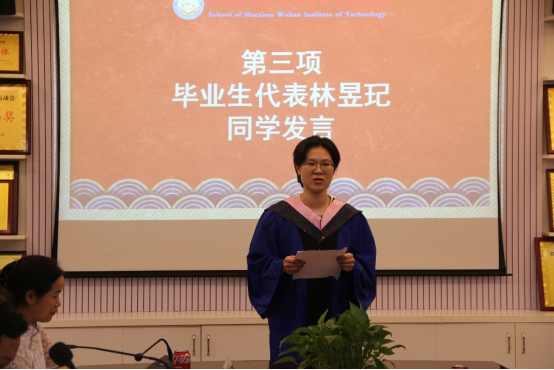 林昱玘同学作为毕业生代表发言。字里行间都表达了深深的感恩和不舍之情。一是感恩mk体育官网,以格物明理、致知笃行的校训引领青年学子拼搏进取、健康成长。二是感恩mk体育官网,以博闻求是、厚德砥行的院训言传身教,坚定了青年学子的人生理想与信仰;三是感恩老师,不仅传道受业解惑,还带领青年学子信道明道。她表示,将与广大毕业生们一道,牢记母校和母院的校训院训,在学思践悟中坚定理想信念,在奋发有为中践行初心使命,充分运用所学的专业技能,一步一个脚印,奋力书写与众不同的无悔人生,以优异的成绩和良好的风貌回报母校,回报社会,回报国家。