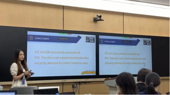 赵紫文所在小组以“ACR和FCF对企业价值影响的实证分析”为主题,利用stata进行多元回归,研究ACR和FCF这两个变量对企业价值的影响程度。最终顺利完成来自英方专家的考核,获得较好评价。