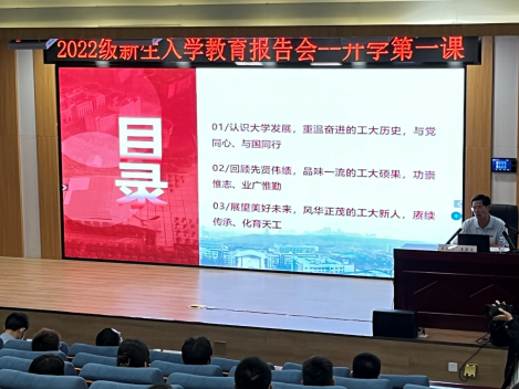第一课中,王校长带领我们回首过去,一代代工大人遵循格物明理,致知笃行,五十载风雨兼程,五十载携手向前。正是一代代工大人艰苦奋斗,工大从无到有,发展到今天拥有数万学子的高等院校,累累傲人的硕果,是无数工大师生努力奋斗的见证,沁人心脾的文化氛围是工大师生踏出的一片晴空。 “工大有你才一流”校长希望我们怀着一颗渴求知识的心,勇于拼搏、自强不息,在工大这片肥沃的土中发芽、成长,为工大增添了抹抹碧绿。