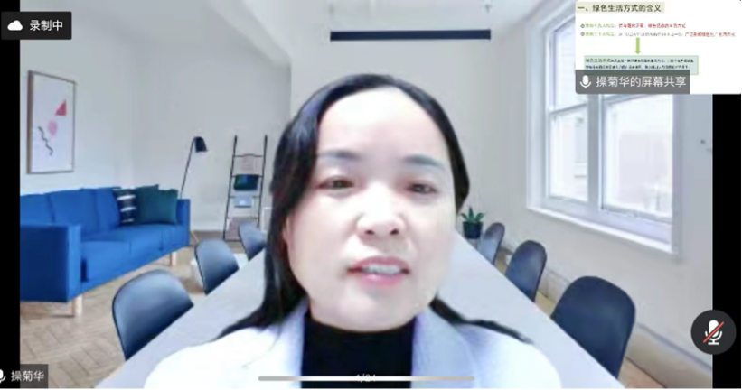 最后,操菊华教授结合党的十九大、二十大报告讲述了绿色生活方式的含义与重要意义,指出绿色生活方式是满足人民群众追求美好生活的必然要求,也是实现人与自然和谐共生的现代化的必然要求。操老师与同学们积极互动,认真解答了同学们的相关疑惑,增进了同学们对于绿色生活方式的理解。本次课程最终以陈沚欣同学的发言总结作为结尾。