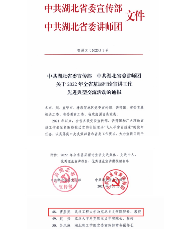 (通讯员:祁君)1月13日,中共湖北省委宣传部、中共湖北省委讲师团印发《关于2022年全省基层理论宣讲工作先进典型交流活动的通报》,对理论宣讲成效突出的50个基层理论宣讲先进集体、50名基层理论宣讲先进个人、36篇优秀理论宣讲报告、22个优秀理论宣讲微视频予以通报表彰,其中,我校mk体育官网院长曹胜亮教授荣获2022年全省基层理论宣讲先进个人。