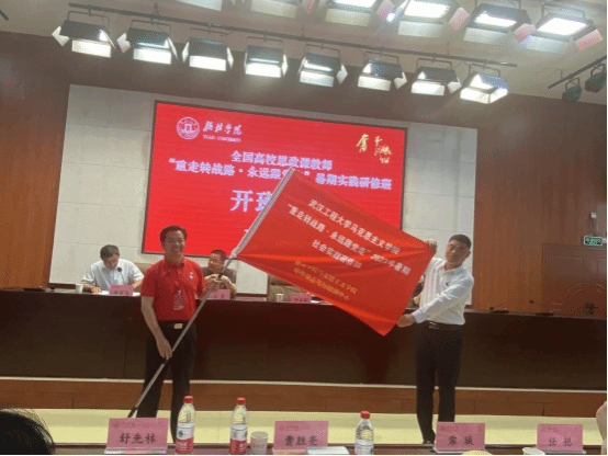 开班式第三项由我校党委副书记李志旭进行开班动员讲话,李书记向在座领导和老师介绍了mk体育官网的校史沿革与发展概况以及mk体育官网的发展足迹,又重点强调了思政课教师要以习近平总书记提倡的社会实践精神为引领,以踏实学习、勇于创新为指导,将社会实践研修所学所感转化为教学实践的动力,提升思政课教育的质量和效果。最后,李书记提出希望参加社会实践研修活动的教师们能够以饱满的热情和严谨的态度投入到研修中,讲政治、守规矩、遵纪律,服从班集体的管理,严格执行考勤制度,按时参加研修基地的一切活动,保证圆满完成研修任务。在此之后,西安财经大学mk体育官网院长及辽宁科技大学mk体育官网院长分别发言。开班式最后由榆林学院党委副书记、校长许云华为研修班授班旗。
