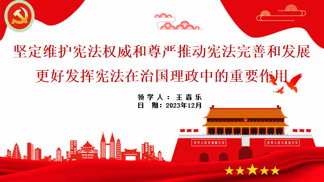 王喜乐同志逐字逐句对习近平总书记在第十个国家宪法日之际作出的重要指示进行了领学。她分享了习近平总书记作出的重要指示要求,要加强对青年一代有关宪法理论的宣传教育,坚持知识普及、理论阐释、观念引导全面发力,在全社会大力弘扬宪法精神、社会主义法治精神,推动宪法实施成为全体人民的自觉行动。她谈到,新征程上我们要深入学习贯彻中国特色社会主义宪法理论,不断把全面贯彻实施宪法推向深入。