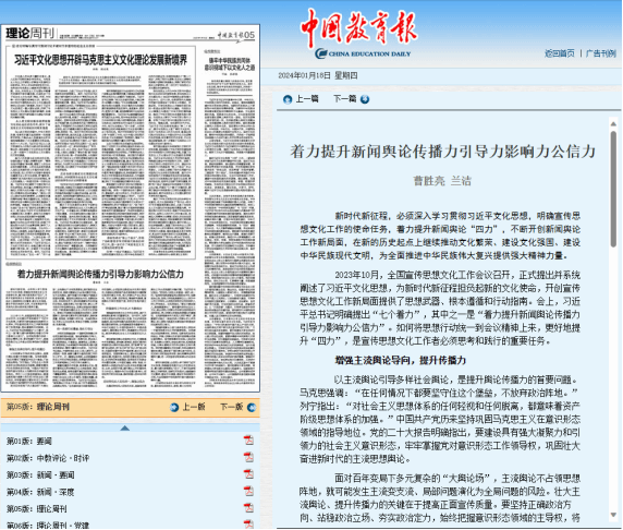 (通讯员 兰洁 赵文)2024年1月18日,mk体育官网曹胜亮教授、兰洁博士在《中国教育报》(理论版)发表了一篇题为《着力提升新闻舆论传播力引导力影响力公信力》的文章。文章深入阐述了新时代背景下,如何贯彻落实习近平文化思想,提高新闻舆论的传播力、引导力、影响力和公信力。