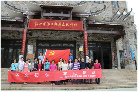 今年是马克思诞辰200周年,5月5日是马克思的生日,为了纪念马克思的诞辰,党员们到达姚家山村后,在新四军第五师历史陈列馆前广场上,接力读诵了马克思《共产党宣言》、《关于费尔巴哈的提纲》、《资本论》、《黑格尔法哲学批判·导言》等作品中的经典语录,以缅怀这位伟大的无产阶级革命导师。