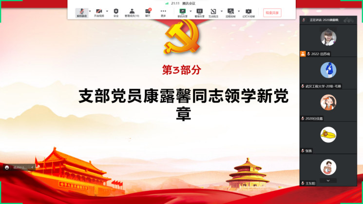 (通讯员:唐玙鈉 田苏琦)12月30日下午13:30,研究生第三党支部于线上腾讯会议开展十二月份支部主题党日活动。第三党支部全体党员参加活动,活动由党支部副书记田苏琦主持。