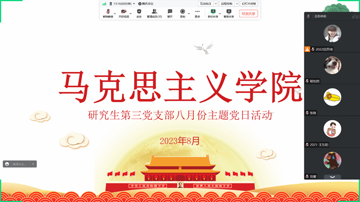 (通讯员 王萍 田苏琦)2023年8月29日晚上19:30,mk体育官网研究生第三党支部通过腾讯会议开展了八月份的主题党日活动。会议由党支部副书记田苏琦主持,研究生第三党支部全体学生党员参加。
